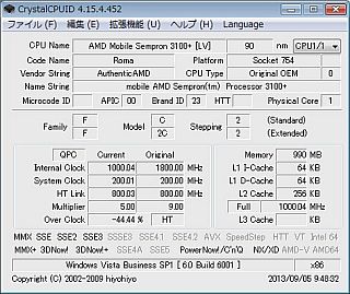 CPUファンの騒音が減らないので、試にCrystalCPUIDで、クロック周波数を1GHzまで落としてみた。_左表_