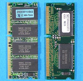 装着されていたSDRAMは左写真の左側のものですが、手持ちの素性が分からない右側のような32MBを挿したら、始めはトラブっていましたが、弄っている内に正常な96MBになりました。_ソケットの接触不良だったのかな?_
