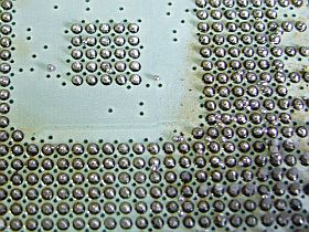 デバイスを外した跡には、小さな丸い半田粒が、幾つも転がってましたが、これらは多分、デバイスを外した時に、元のボールから千切れて落ちたものが、小さく丸まったのだろうと思います。_左写真&<クリック>_