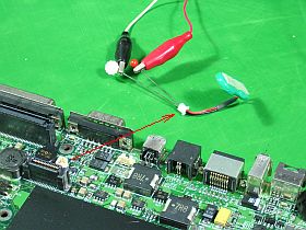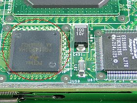 途中段階では、どうも、あの小バッテリだけの問題ではないのではないかと疑心暗鬼。そう考えると、焼け焦げた感じのPCIbusインタフェースLSIも怪しい事は、怪しい!_左写真、赤丸印_