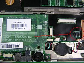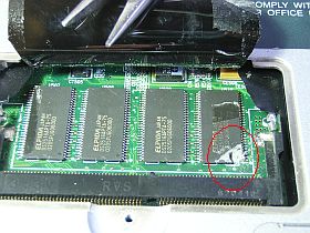 噂には聴いて/読んでいましたが、左写真のように、やはり内蔵メモリが壊されていました。_左写真の赤丸印。チップは、ELPIDA DS2516APTA-75_