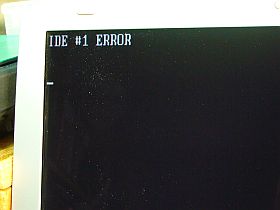 周辺確認後に、メモリとHDDをセットして電源_アダプタ15V,4A_を入れたら、IDEエラーが出ました!ん?_左写真_