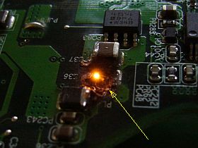 電流容量の大きな電源を使ったら、ショート部が火花を散らして燃え出しました!ギョ!_左写真_