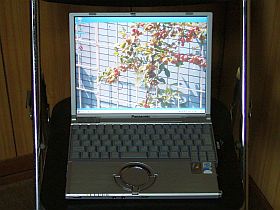 バッテリは、_標準は5時間らしいが、_表示しっ放しで約100分間ほどは持つ/保つようなので、あちこち屋内を持ち歩けそうです。_左上写真&<クリック>_