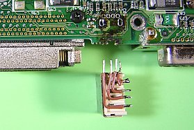 問題だったのは、USBレセプタクルの方で、これが縦型。しかも、短胴型のため、半田側ピンが狭い横配列になっていました。