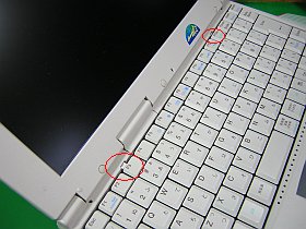 まず、キーボードを外せば良さそうだとの感じはあったのですが、裏面には適当なビス孔が無い...上面を探したら、キーボード留めのが、上の2箇所にありました。_左写真の赤丸印_