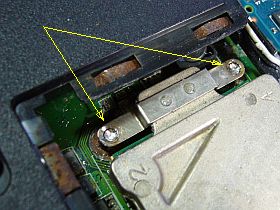 裏面側から、_ビス径=約2.5mmφなので、2mmφのドリル刃を使用して、_電動ドリルで穴開けをしたら、固着していたビス殻が下に落ちました。_やった!__左写真。矢印の先は、ビス殻_