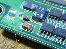 ショート箇所を調べるのに、DC電源プラグを挿して電流を3Aほど流しておいて、基板上を手・指で探る方法を採りました。