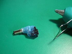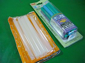 金属部を覆うのにホットボンドを、よく使っているのですが、今回も以前使った「透明スティック」_左写真_をそのまま使いました。_ガンの中に沢山残っているので、そうせざるを得ないのですが_