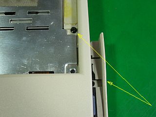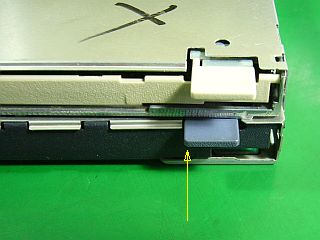 次は、厚さの問題で、余分なカバー類は全部外すとして、「タッチパッド支え金具」の右側が邪魔で標準FDDがそれに乗っかって浮いてしまい、本体の上下が閉じられないほど。_左写真_