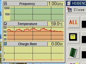 CPUファンを停止した状態では、温度上昇と上限が問題ですが、「MobileMeter」_hexmagicさん作_を使わせて貰って、調べてみました。