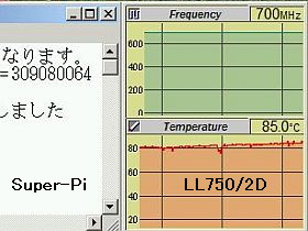 Super-Piで計算させたら、700MHzでも、CPU温度は85℃を超えて、まだまだ上昇し続けます。_こりゃ、駄目だ!左図_