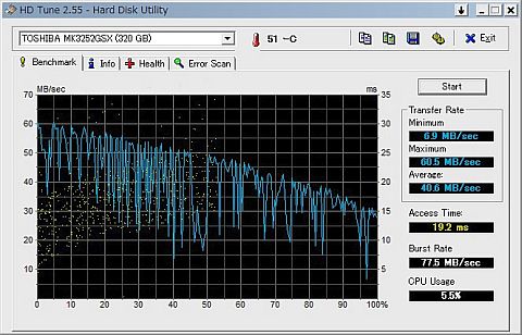 先の「HDBENCH」のALL値では、あまり分からなかったが、「HD Tune」のベンチマークで見たら、劣化が進んでいるように見えた。