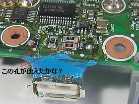 USBコネクタ端子に半田付けする時に、後ろの電解コンデンサがちょっと邪魔です!これは外してしまっても影響は無いと思うのですが、よく分からないのでそのままにしました。