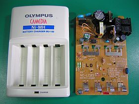 中身は、恐ろしくシンプル!整流後の平滑コンデンサすらありません。(ま、充電池の方は、脈流で充電されても、別に気を悪くはしないでしょうけど)