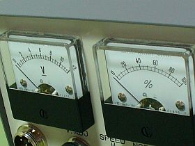 (ネット・オークションで、面白い?ジャンク装置を手に入れた(総費用\1,577)のですが、それの“改造噺”は別途とし、)今回は、その装置に付いていた電圧計と%計(!)の目盛/スケール(左写真)を、改造しました。