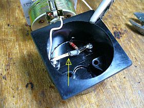 分流器を極力薄くなるように作って、底に貼り付けるようにしたつもりですが、底が支えてメータ本体が少し浮き上がる感じがして、何度も半田付けをやり直しました。(左写真)