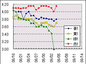 そこで、試しに充電後から毎日、端子電圧を測ってみました。やはり、それらしい兆候が見えます。(物は、台湾製セルの廉価版新品)