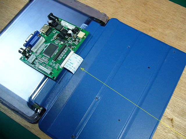 I fasten the "driver board" inside the "cover" and connect the "VGA cable" and "power cord" from below, then it became pretty neat! ( Fig.2 [click] )