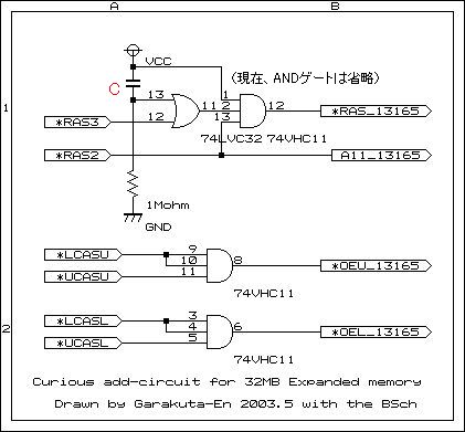 なので、立ち上がり初期には半分の16MBだけで動作させ、立ち上がった時点で"レジスタ書換えプログラム"でメモリ制御レジスタを書直して、残りを有効にします。そのために、初期遅延用のC・R(容量と抵抗)と封鎖用のORゲート回路を使用しています。