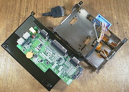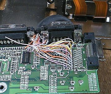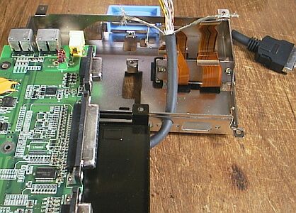 I cut the cable of the FDD at the position of about 15mm inner from the cable edge, and that I stripped the cover about 70 to 90mm. (See the pictures.) I made a hole of about 6mm diameter between connector hole of the PI/O and SI/O on the metal case, then passed the cable through the hole.