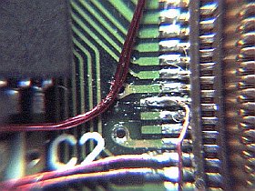 左の写真はPC110用拡張メモリの端子部。<クリック>で、Pentiumの端子。