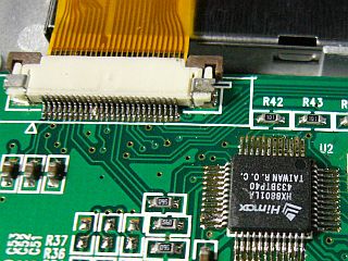 このHX8801というLSIは、TFT液晶のソース・ドライバ群やゲート・ドライバ群を順次、開閉して行くためのタイミング信号発生器のようなもので、先のMM1288で分離・生成した水平同期、垂直同期信号を基準にして、木目細かいタイミング信号(シフト・クロックと呼ぶ)を自家発生させるらしい。(図6<クリック> PDF資料
