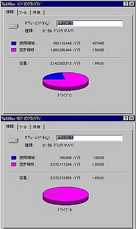 どうやら、TP230Csでは、4.2GBが最大の限界らしく、またFAT16にしたので、2GBが2ドライブになりました。