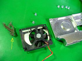 取り敢えず、本体を分解して、冷却ユニットを取り出して、ファンを取り外して見たら、わー、埃が塊になっていました。(左写真)