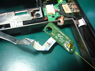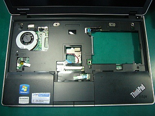 機種によっては、「液晶表示部」を一旦分離してからでないと、「上板(パームレスト兼用)」を外せないタイプもあるのだが、この機種はその必要も無く、簡単に「上板」が外せて、「主基板」を露出させることが出来た。(図4<クリック>