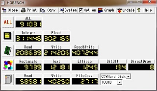 組み込んだWin7の上で、(標準的に使わせて貰っている)ベンチマーク「HDBENCH」を走らせて見たが、その結果は大変良い!