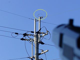 ターゲット達、平生(へいぜい)は、道路を隔てた斜め向かいの電柱の天頂辺りに良く来るのだが、今日は来ていないので、狙ってみるだけ。(左写真)