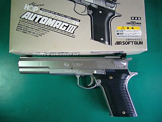 んなら、ちょっと身体でそれを覚えて貰おうか!と、(魔流さんの唆(そそのか)しもあって?笑)BB弾を飛ばせそうな「玩具 エア・ソフト・ガン AUTOMAG III」のジャンク品を買ってみた。(左写真 総費用\1,130送料込み)