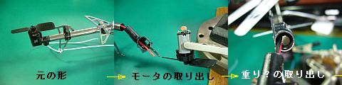 ついでに、ブームの中に入っていた重り?らしき直径5mmΦ、長さ10mm程の金属棒は、少しでも後ろを軽くしたいと思い、取り除きました。これで、少しでも機体が前屈みになり、前進し易くなればいいのですが...(左上写真<クリック>)