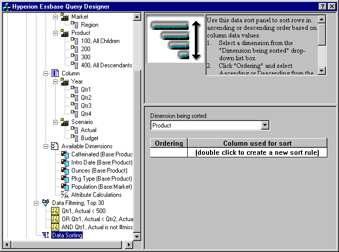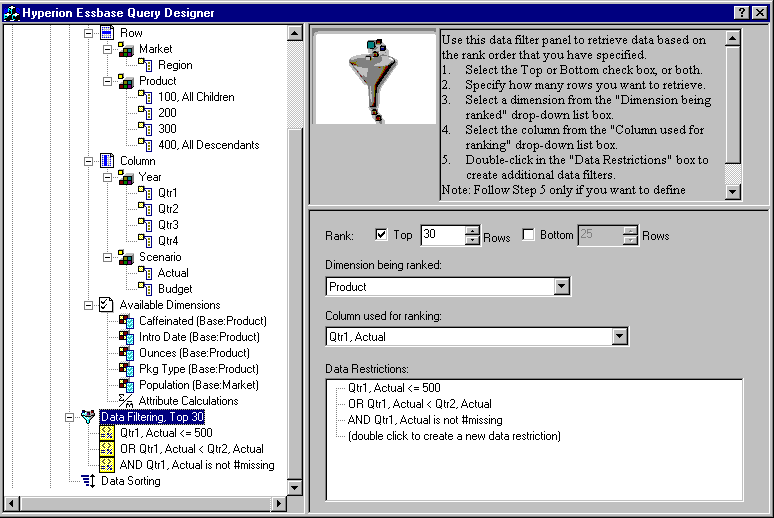 Despite the ease and speed with which you can navigate through large Hyperion Essbase databases, it is not practical to use the capabilities of Excel to filter and sort very large databases; however, the Essbase server includes powerful data filtering and sorting capabilities. In "A Basic Essbase Tutorial", you learned to use Essbase Query Designer to define a dimensional layout and to select members to view. Essbase Query Designer also provides a powerful, yet easy-to-use tool to define conditional retrievals.