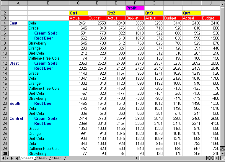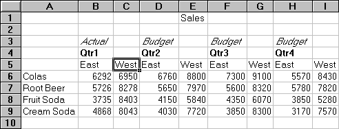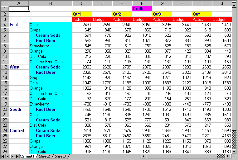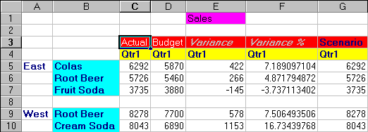 In Asymm.xls, row and column dimension groups are asymmetric. Thus, the nested member groups from the Product dimension differ in member content within respective markets. For example, Colas and Fruit Soda are included in East but not in West. In addition, Actual data is displayed for Qtr1, whereas Budget data is displayed for Qtr2, Qtr3, and Qtr4. Also notice that the sample file displays styles for members of the Scenario and Year dimensions.