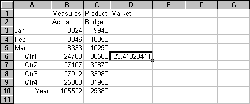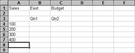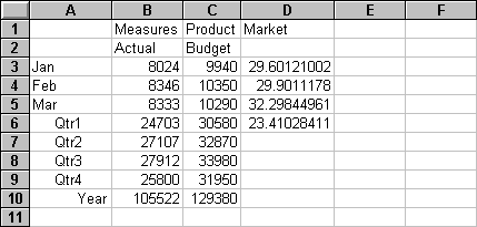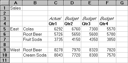 When you retrieve data into a worksheet, the resulting report can be either symmetric or asymmetric. Symmetric reports are characterized by repeating identical groups of members. For example, Figure Figure 94 shows a symmetric report that contains Actual and Budget members nested below Year members (Qtr1, Qtr2, Qtr3, and Qtr4).