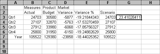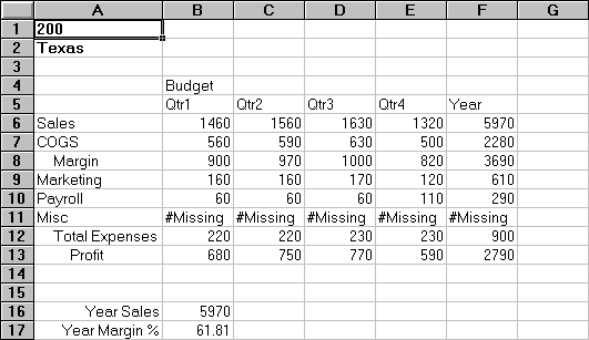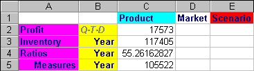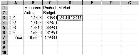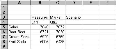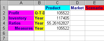 Now define a free-form report that does not contain all of the dimensions from the database. In Advanced Interpretation mode, you may need to enter a dummy data value, such as 0, into the first Essbase data cell to tell Essbase where the data starts in the worksheet. Be sure to use a numeric value as the dummy value.