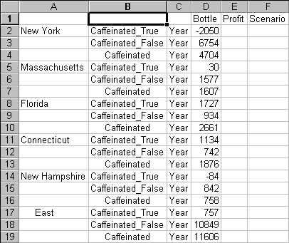 5. To drill down further for data on profits for the first quarter for all members of the East base dimension, double-click on cell E1. The results should display as shown below: