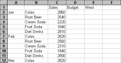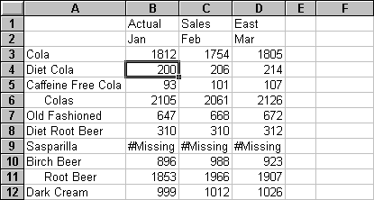 Essbase combines the Product members into all unique members. For example, Root Beer, which is displayed twice in Figure Figure 95, is displayed only once in the current view. Colas, which is displayed in only one market in Figure Figure 95, now is displayed in East and West.