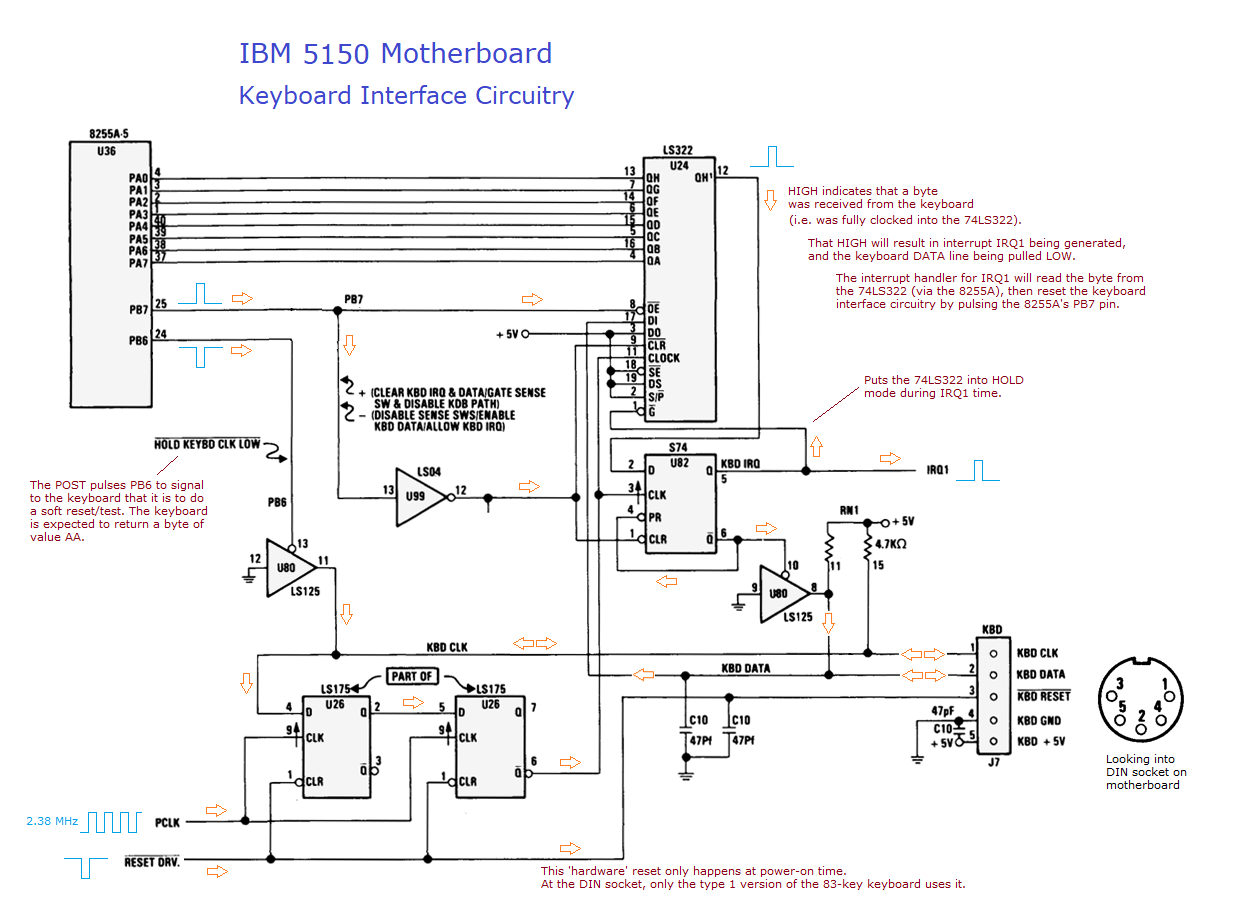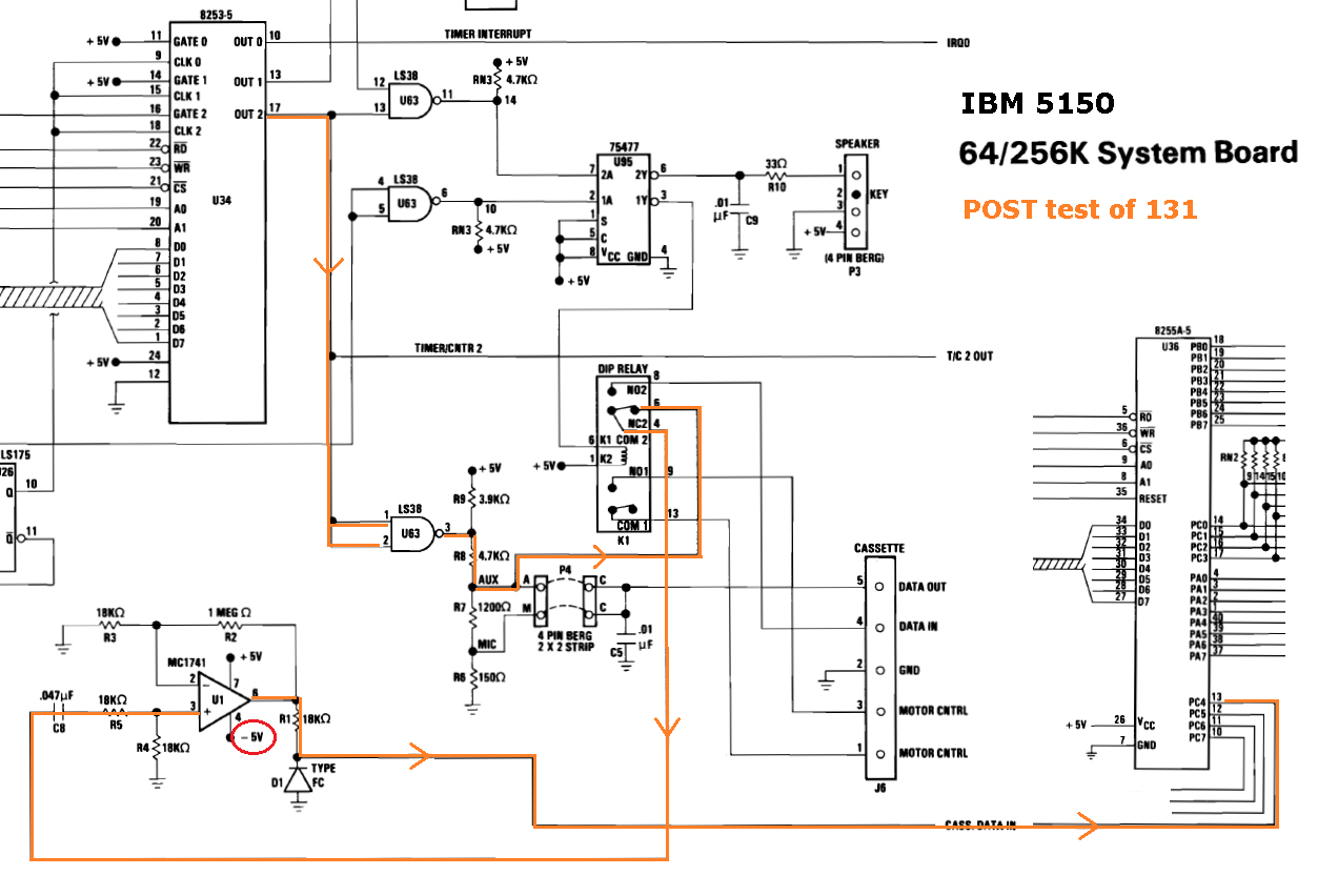 • 5150 motherboard of type 64KB-256KB is not receiving minus 5 volts (chip U1 on the 5150 motherboard requires minus 5 volts).