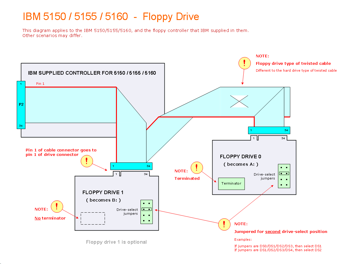 • Floppy cable - not the correct type for a 5150 - see here.