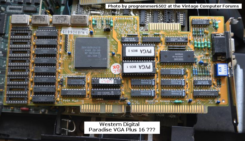 | Note 4 | Model based on the fact that Western Digital (WD) released a card known as the 'Paradise VGA Plus 16', and printed on the subject card is 'PVGA PLUS-16'. Possibly a non-WD copy, because: 1. No FCC ID, and 2. BIOS stickers do not look to me like the kind of thing that WD would use. |