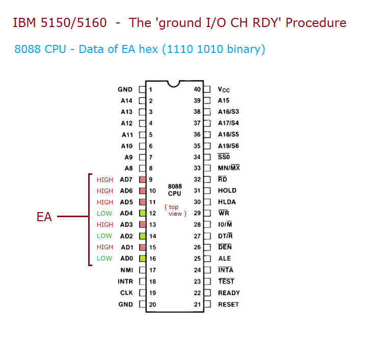 | Step 9.1 | On the AD pins (AD7 to AD0) of the 8088 CPU, expect to measure the data of EA hex (1110 1010 binary). See here. |