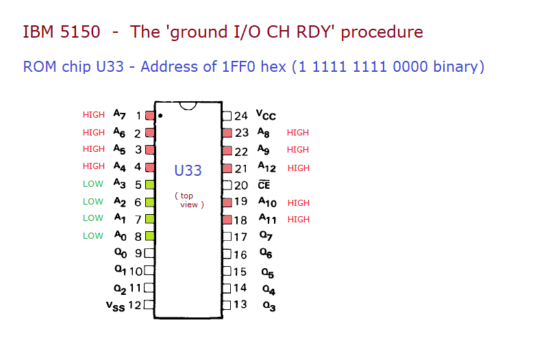 | Step 5.1 | If an IBM 5150, on the address pins (A12 to A0) of ROM chip U33, expect to measure the address of 1FF0 hex (1 1111 1111 0000 binary). See here. |