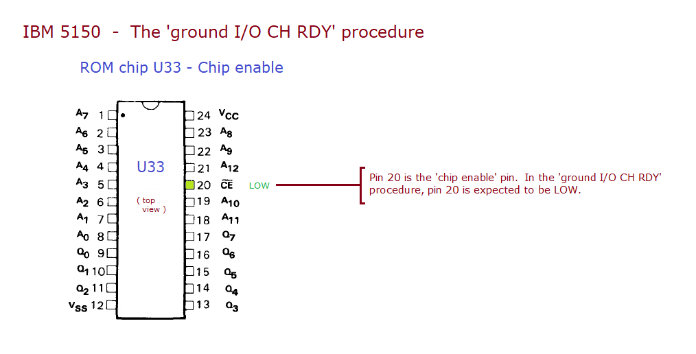 | Step 6.1 | If an IBM 5150, verify that pin 20 (/CE) of ROM chip U33 is LOW. See here. |