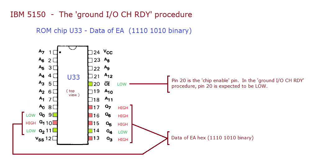 | Step 7.1 | If an IBM 5150, on the data pins (D7 to D0) (Q7 to Q0) of ROM chip U33, expect to measure the data of EA hex (1110 1010 binary). See here. |