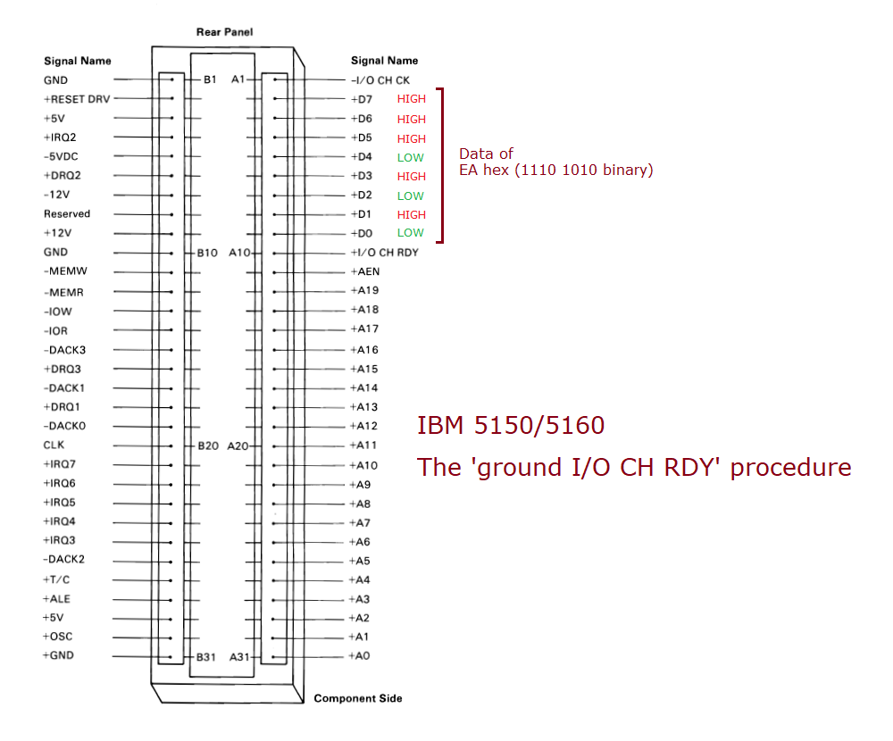| Step 8.1 | On the data pins (D7 to D0) of an ISA slot, expect to measure the data of EA hex (1110 1010 binary). See here. |