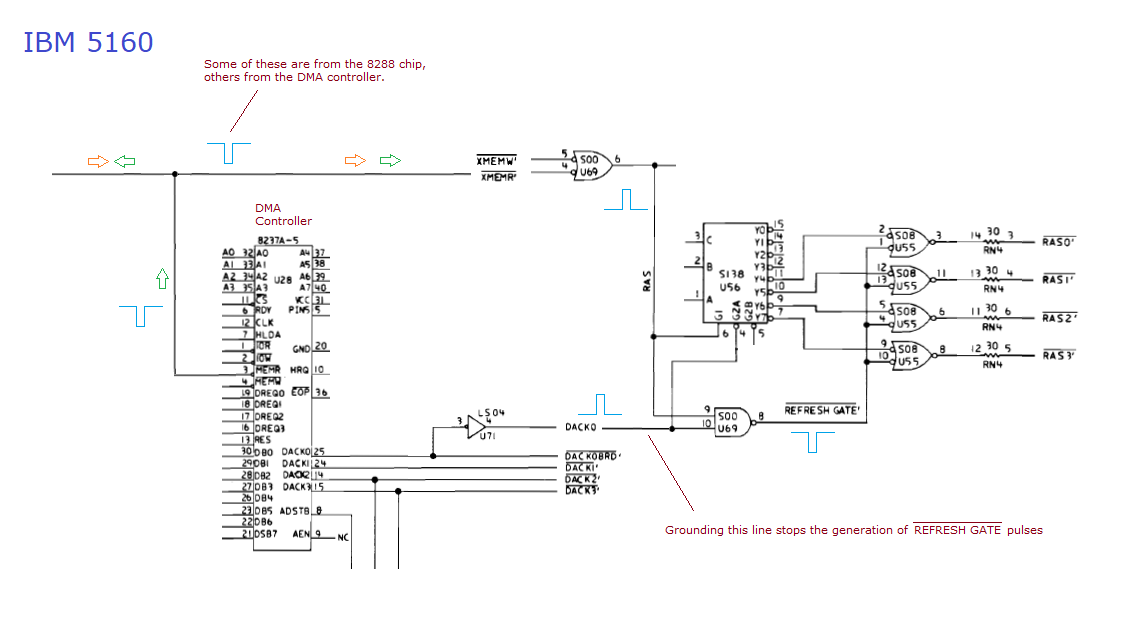 For the IBM 5160, RAM refresh was disabled by grounding pin 4 of chip U71.  See note 1 below.