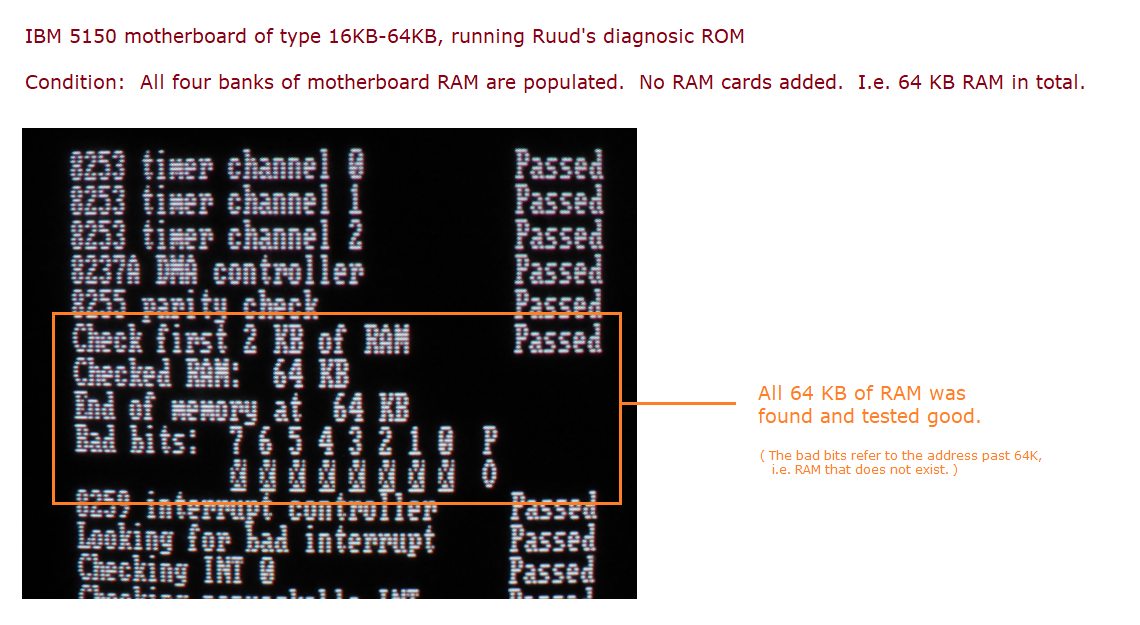 Ruud's diagnostic ROM:   64 KB of RAM passed per here on first and all subsequent iterations.